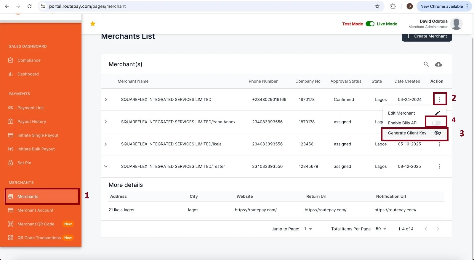 • Navigate to the Merchants section to view the list of all merchants.